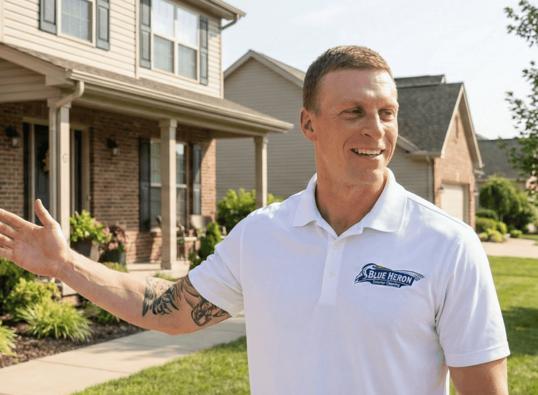 Restoring an oxidized home requires a specialized Restoration Wash, not just a standard cleaning. Here is how Blue Heron handles it: